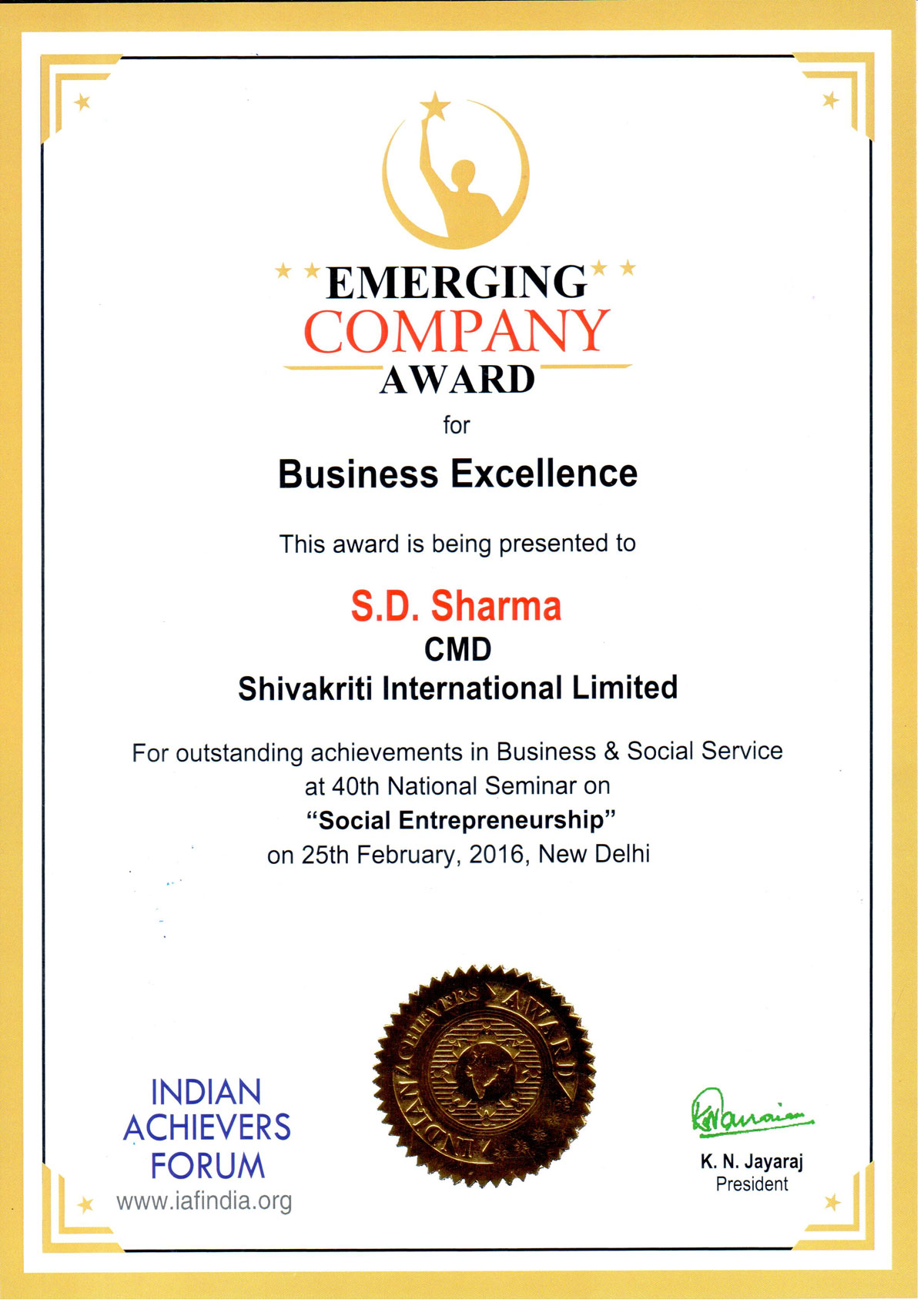 Emerging Company Award for Business Excellence to Shivakriti International Limited for outstanding achievements in Business and Social Service at 40th National Seminar on "Social Entrepreneurship" by Indian Achievers Forum